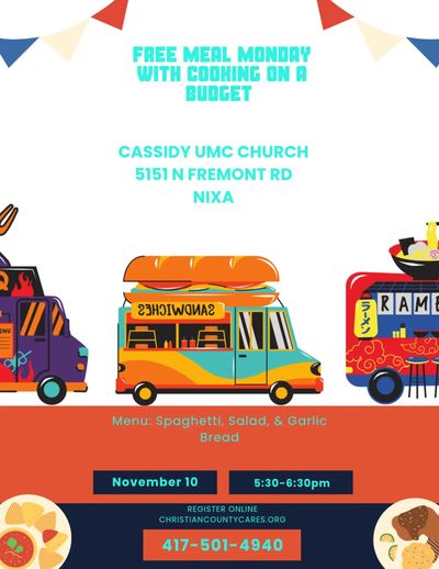 Join us Monday Nov 10th at Cassidy UMC Church for a free meal and cooking on a budget.